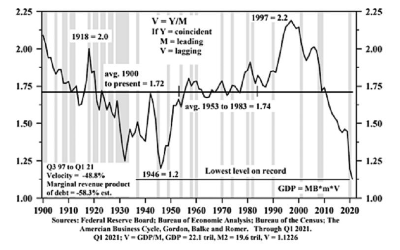 Abbildung I.1 Jährliche Geldumlaufgeschwindigkeit von 1900 bis 2021 . Quelle: Hoisington Management