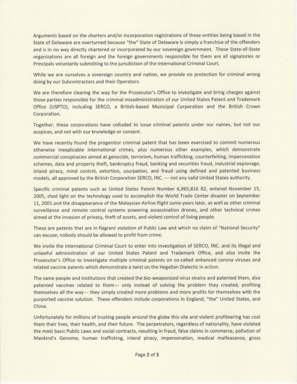 In Anerkennung dieser Tatsachen haben wir dem Internationalen Strafgerichtshof und der Staatsanwaltschaft eine besondere und begrenzte Zuständigkeit gewährt, die spezifisch und begrenzt ist, da ein Nicht-Unterzeichnungsland Vertrauensbruch und Handelsverträge sowie Verbrechen gegen die Menschlichkeit international gegen US-Personen und juristische Personen, die an internationalen Verbrechen wie Kauf und Verkauf, illegale Modifikationen, Piraten im Inland, verfassungswidrige Komplotte, Pressekontrolle, Versklavung, Bauern, Völkermord und Verbrechen gegen die Menschlichkeit beteiligt sind, und Führungskräfte dieser juristischen Personen.