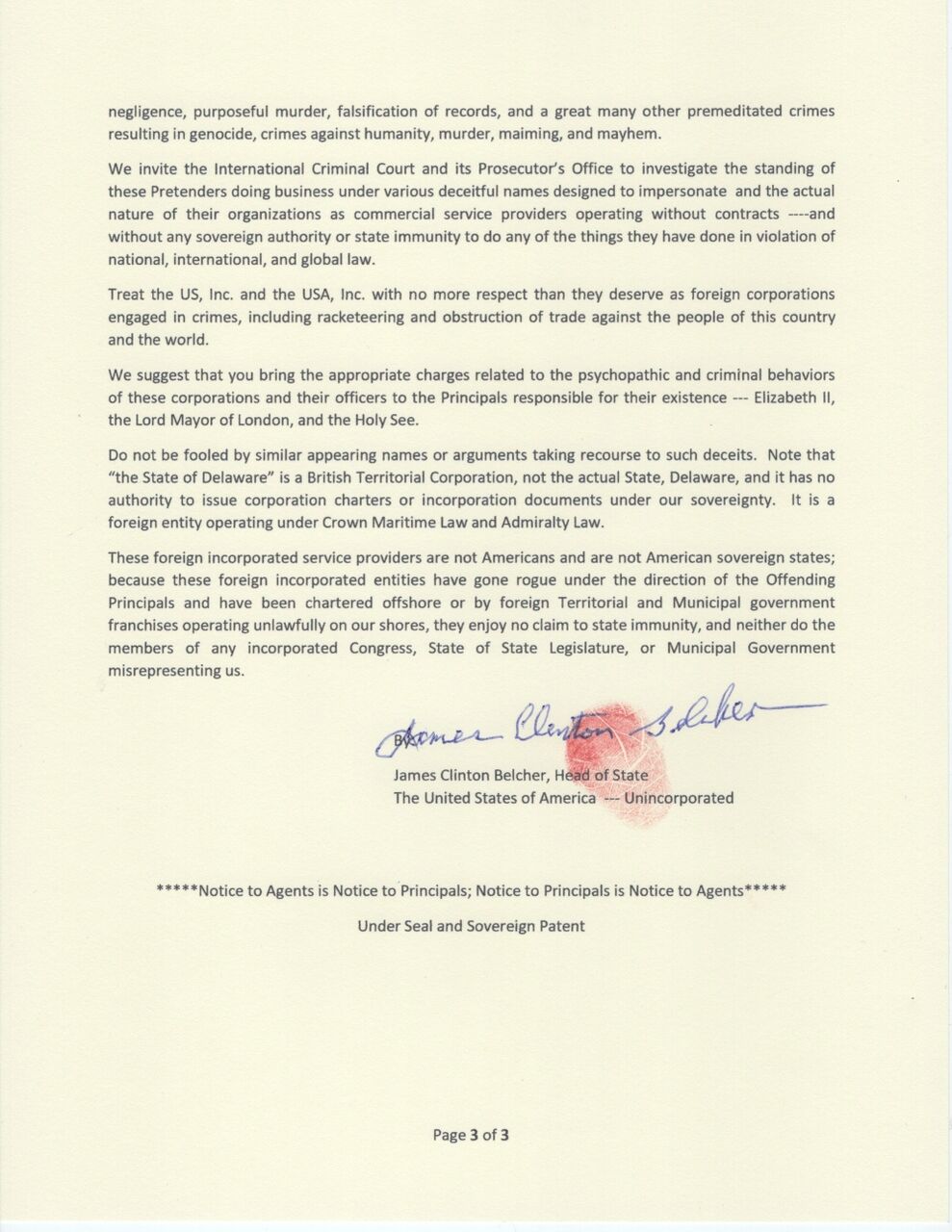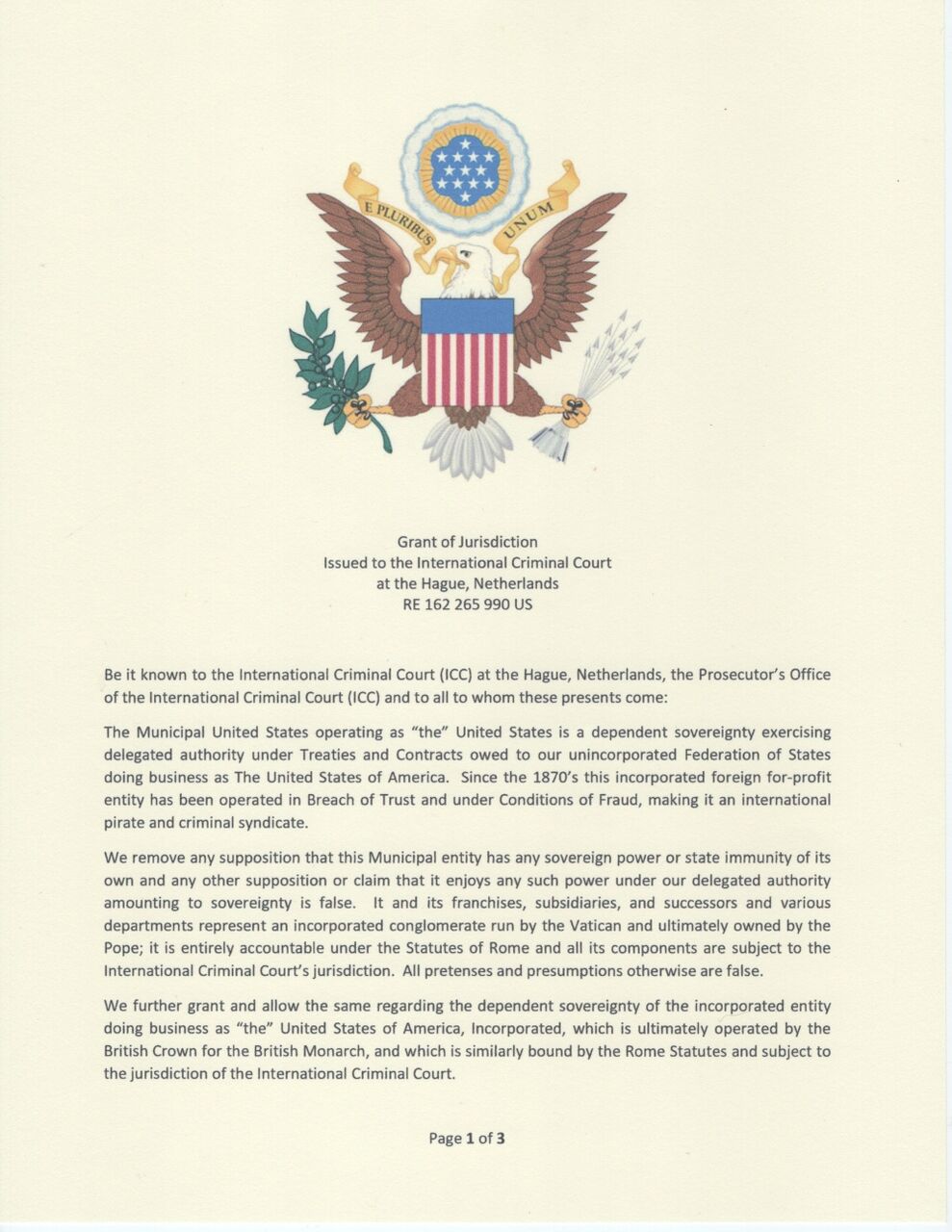Besuchen Sie den Dokumentationsbereich aufwww.annavonreitz.com , um die JPEG-Seite für die Gewährung einer besonderen Gerichtsbarkeit zu sehen, die dem Internationalen Strafgerichtshof (ICC) und der Staatsanwaltschaft ausgestellt wurde .