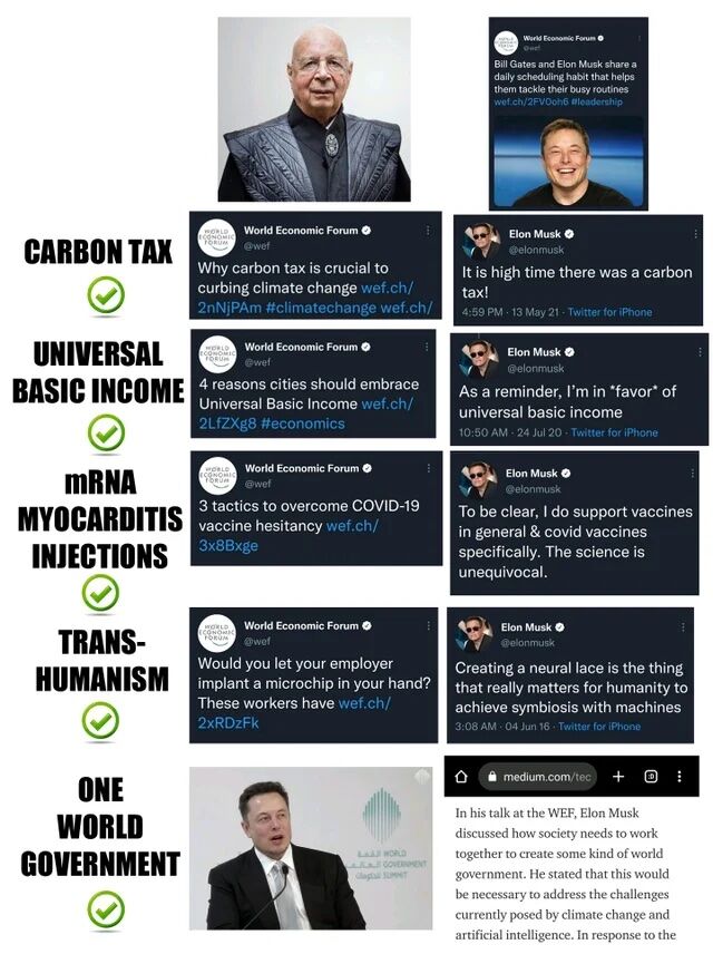 https://youtu.be/16eiyl1URNQ Elon Musk hat eine Beziehung zum WEF, wo er darüber spricht, wie die Gesellschaft zusammenarbeiten muss, um eine Weltregierung zu schaffen. Ein Bloomberg-Artikel bestätigt, dass er der Young Global Leader des WEF ist. Er ist für CO2-Steuern, universelles Grundeinkommen, Impfstoffe, Chips zur Integration von Menschen und Computern und arbeitet mit dem WEF zusammen .