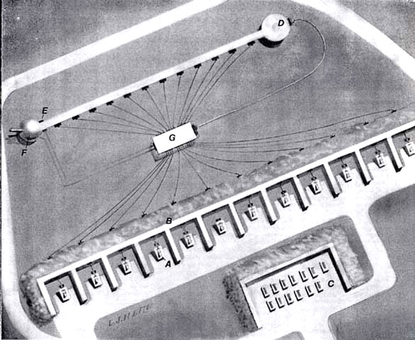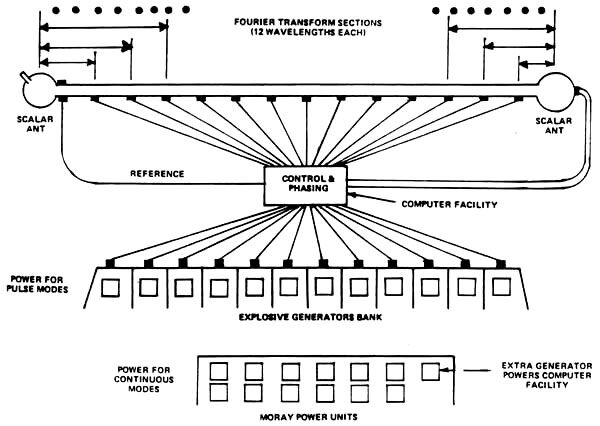 Im kontinuierlichen Schildmodus wird das Tesla-Interferometer von einer Reihe freier Energiegeneratoren von Moray mit Strom versorgt, wodurch der Schild enorme Energiemengen nutzen kann. Abbildung 7 zeigt ein Diagramm der Salishagan-Tesla-Haubitze. Abbildung 6 zeigt eine Detailansicht des Interferometerendes der Tesla-Haubitze von Halcroford.