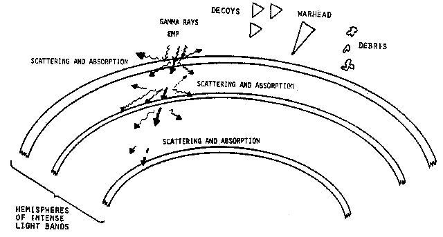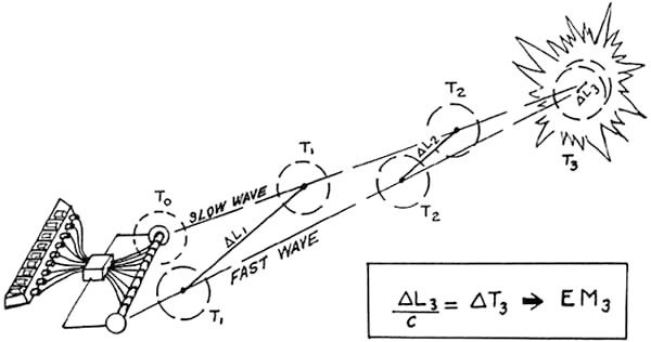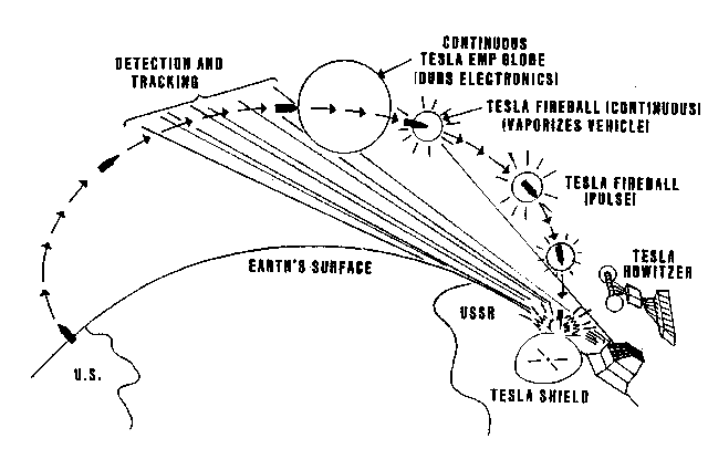 Abbildung 13. Tesla-ABM-Verteidigung Abbildung 14. Moray/Tesla-Technologie: Star Wars Now Abbildung 13 zeigt eine typische strategische ABM-Nutzung für Tesla-Waffen. Darüber hinaus können natürlich kleinere Tesla-Haubitzensysteme für die taktische Kraft und die taktische ballistische Raketenabwehr mit konventionelleren Feldraketensystemen konfiguriert werden, die gepaartes oder Triplet-Radar verwenden. Traditionelles Erscheinungsbild im Skalar-Interferometer-Modus Das ICBM-Wiedereintrittssystem ist jetzt ein Langstrecken-„Blaster“ des Interessengebiets von Tausenden von Kilometern (Abbildung 14). „Star Wars“ wird buchstäblich von Tesla-Technologie veröffentlicht. Und bei Luftangriffen werden Störsender und ECM-Flugzeuge zu „Tesla-Blastern“. Die Tesla-Technologie macht den Emitter zu einer wichtigen Kampfkomponente mit unglaublicher Kraft. Die potenziellen friedlichen Auswirkungen von Tesla Wave sind ebenfalls enorm. Indem Sie sich den „Zeitdruck“-Effekt zunutze machen, können Sie Antigravitation, Materialisierung und Dematerialisierung, Transmutation und enorme medizinische Vorteile erlangen . Sie können auch subluminale und superluminale Kommunikation erhalten und sie durch die Erde und den Ozean sehen. Phifields neue Sichtweise bietet auch eine einheitliche Feldtheorie, Realität höherer Ordnung und neue Superrelativitätstheorie , aber es gibt ein anderes Buch, das diese Möglichkeiten detailliert beschreibt.